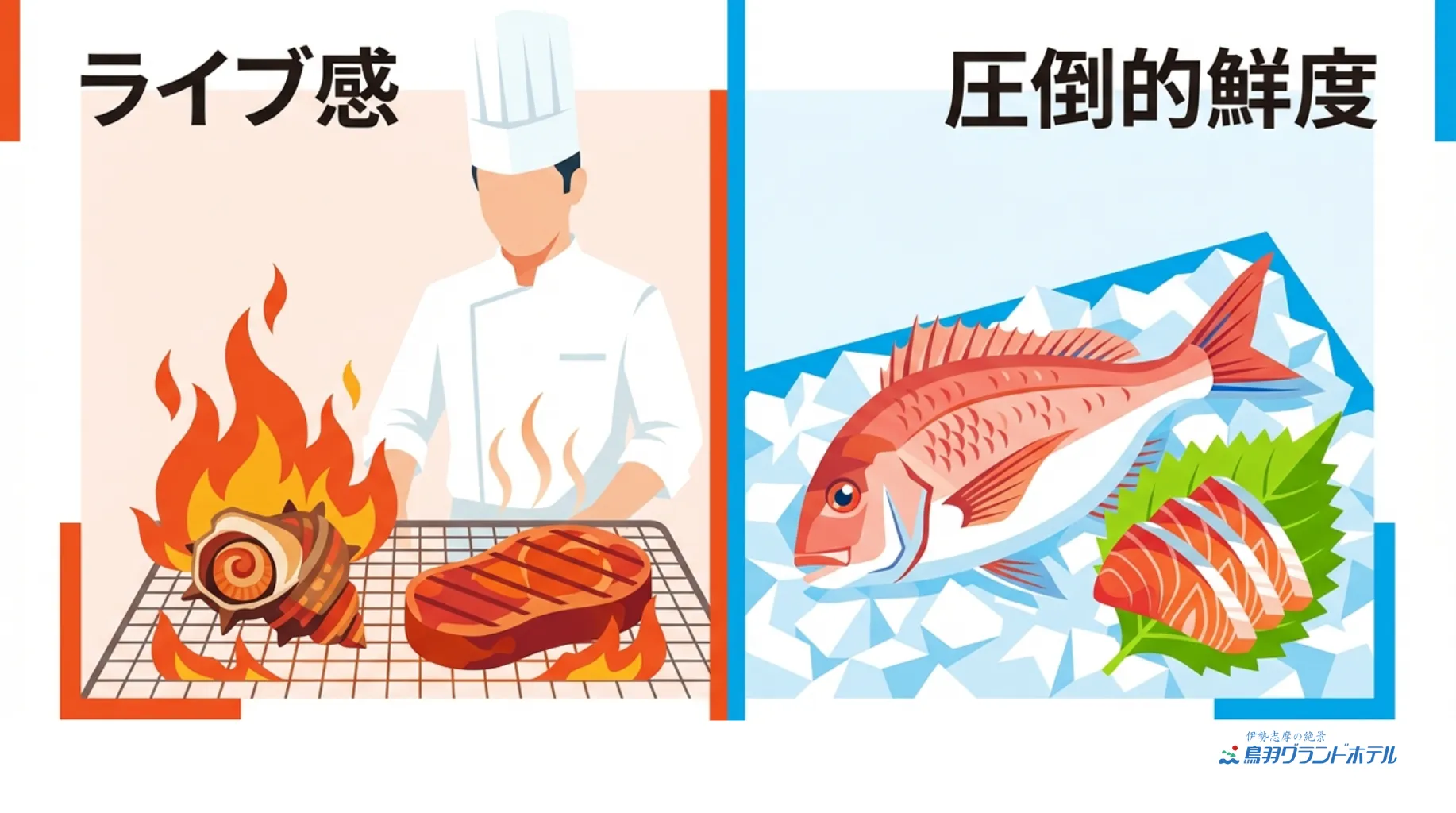 鳥羽エリアの豪華バイキングで堪能できる、ライブキッチンの魅力と海鮮料理の鮮度の秘密