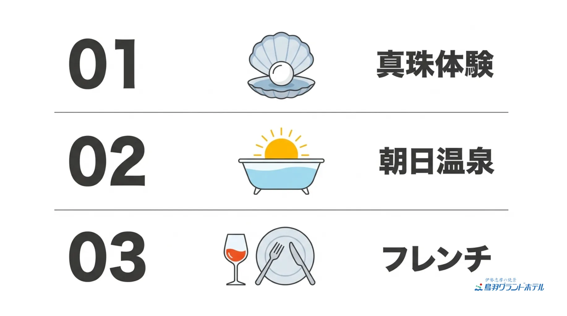 また、予約の際には「真珠アクセサリー作り体験」の枠も同時に確保しておくことを推奨します。今日という日が、あなたの人生をより輝かせる、心洗われる癒やしの旅への素晴らしい第一歩となることを確信しています。鳥羽の穏やかな波音が、あなたの訪れを静かに待っています。