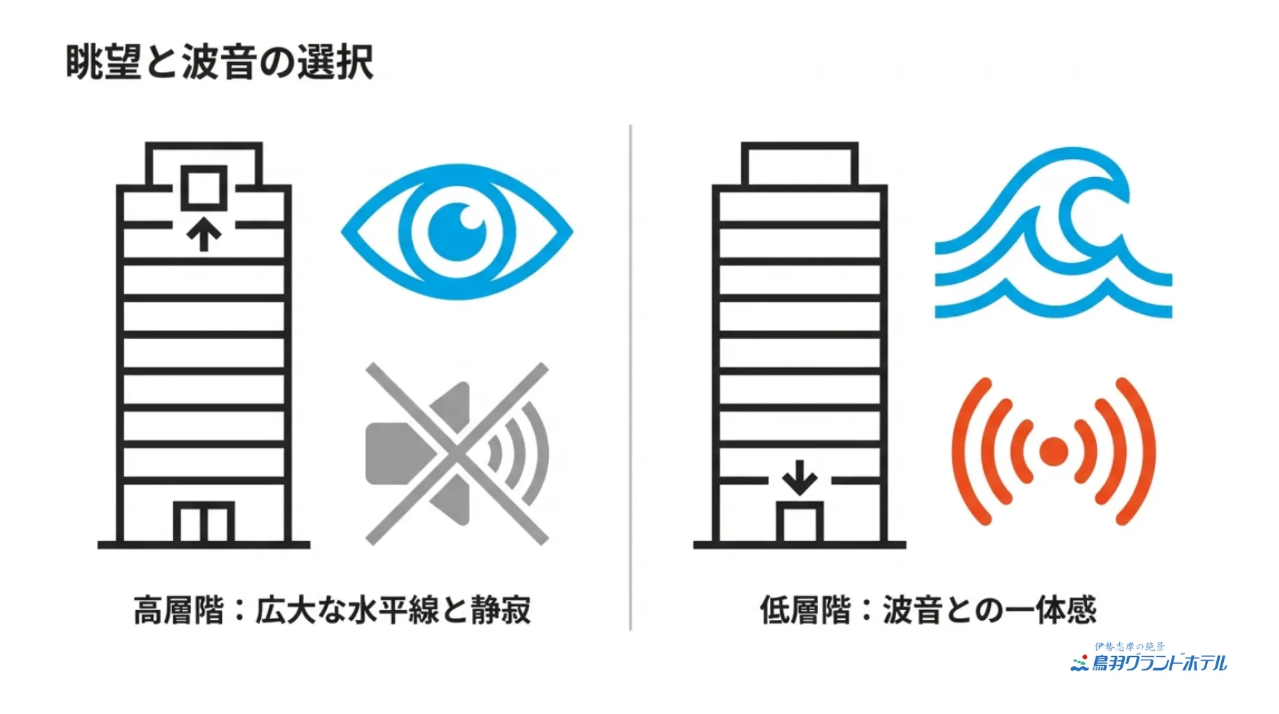 一口にオーシャンビューと言っても、その見え方は千差万別です。波打ち際が近く波音がダイレクトに響く「低層階の客室」と、広大な水平線を見渡せる「高層階の客室」では、得られる体験が全く異なります。静寂を好むなら高層階を、波音との一体感を求めるなら低層階を選ぶのが鉄則です。