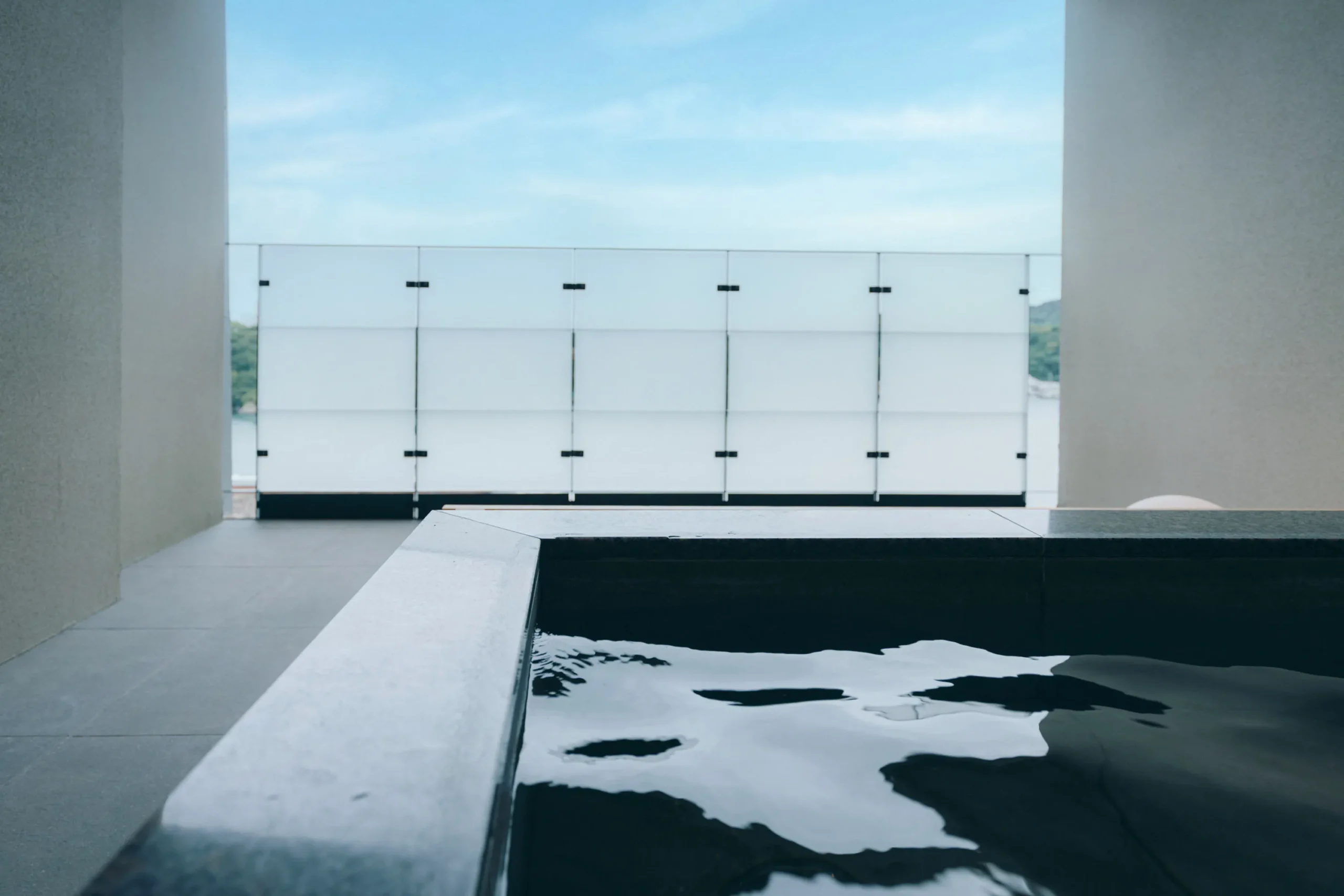 現代のラグジュアリーな宿で主流となっているのが、リビングと露天風呂テラスがフラットに繋がる「ボーダレス」な空間構成です。窓を全開にすれば、潮騒が部屋の奥まで流れ込み、まるで海の上に浮かんでいるような没入感を味わえます。