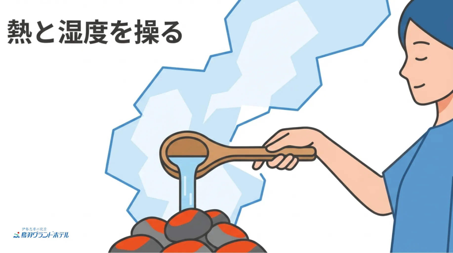 一度に大量の水をかけず、ラドル(柄杓)半分程度の量を「ゆっくり」石にかけることで、質の良い蒸気を発生させる。 - ●