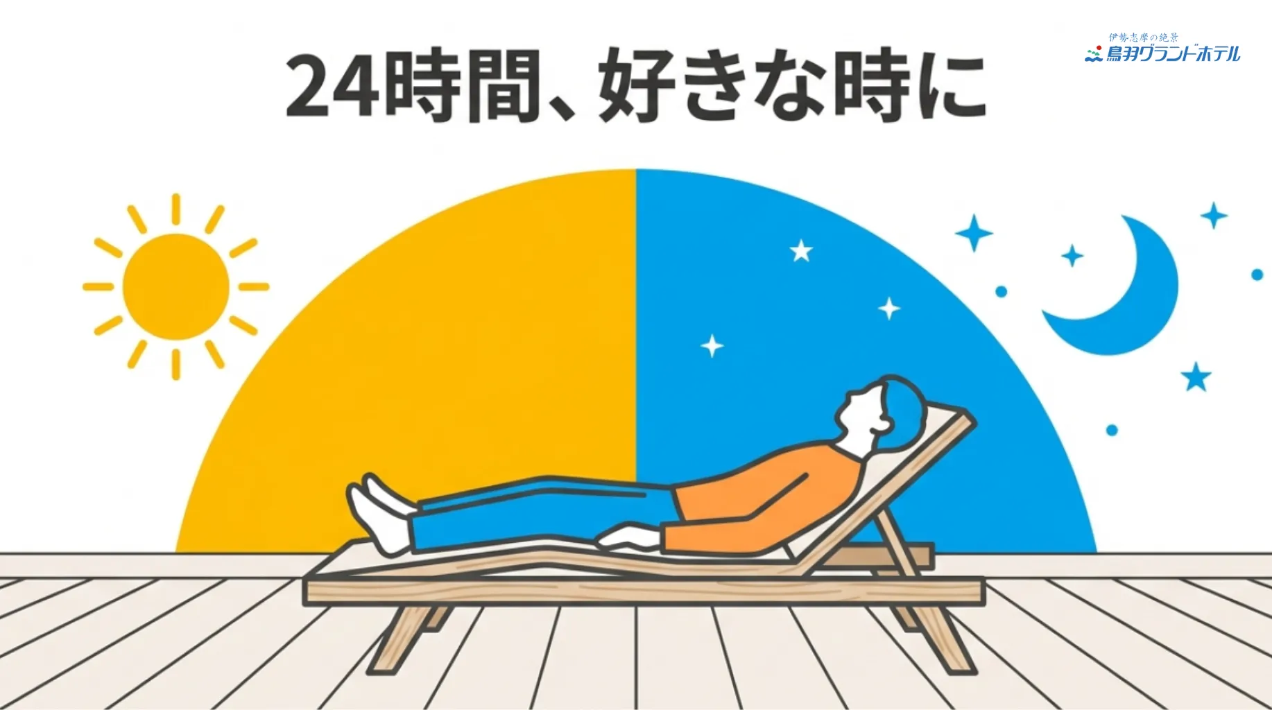- 水分・塩分の確保: 24時間入れるからといって、過度な入浴は脱水を招きます。客室に用意されたドリンクやサプリを活用しましょう。