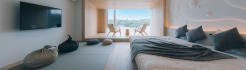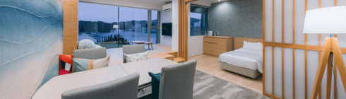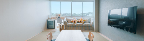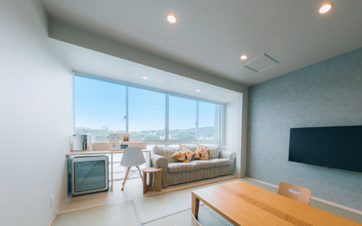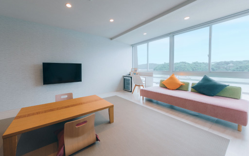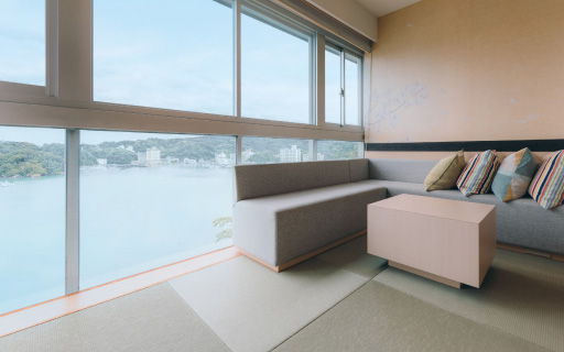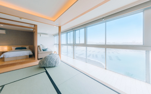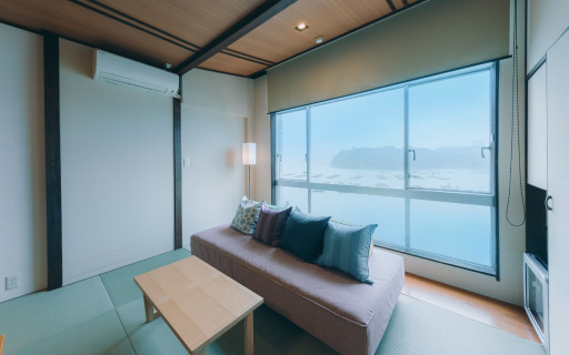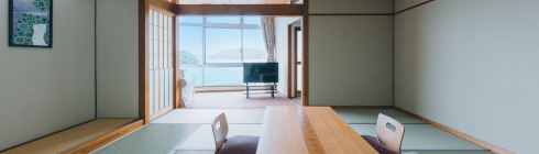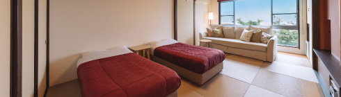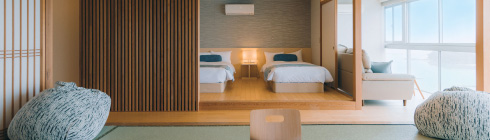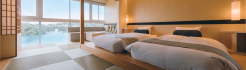 2022年にリニューアルされた12畳の畳空間とツインベッドが織りなす上質な寛ぎで、刻々と移ろう海景色を独占する至福をご堪能ください。
