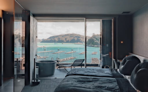 黒を基調にした落ち着きある空間で、鳥羽湾の表情と自然の音に身を委ね心と感覚をほどくひとときをお楽しみください。